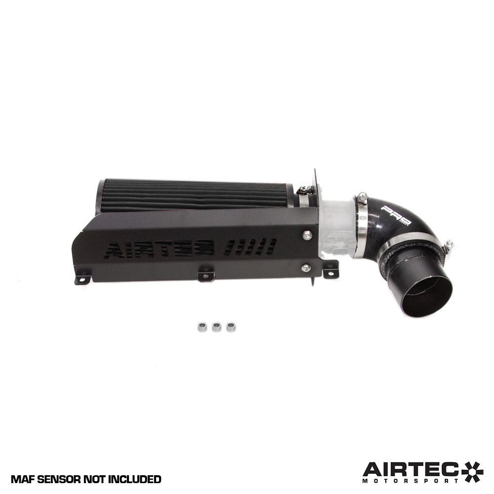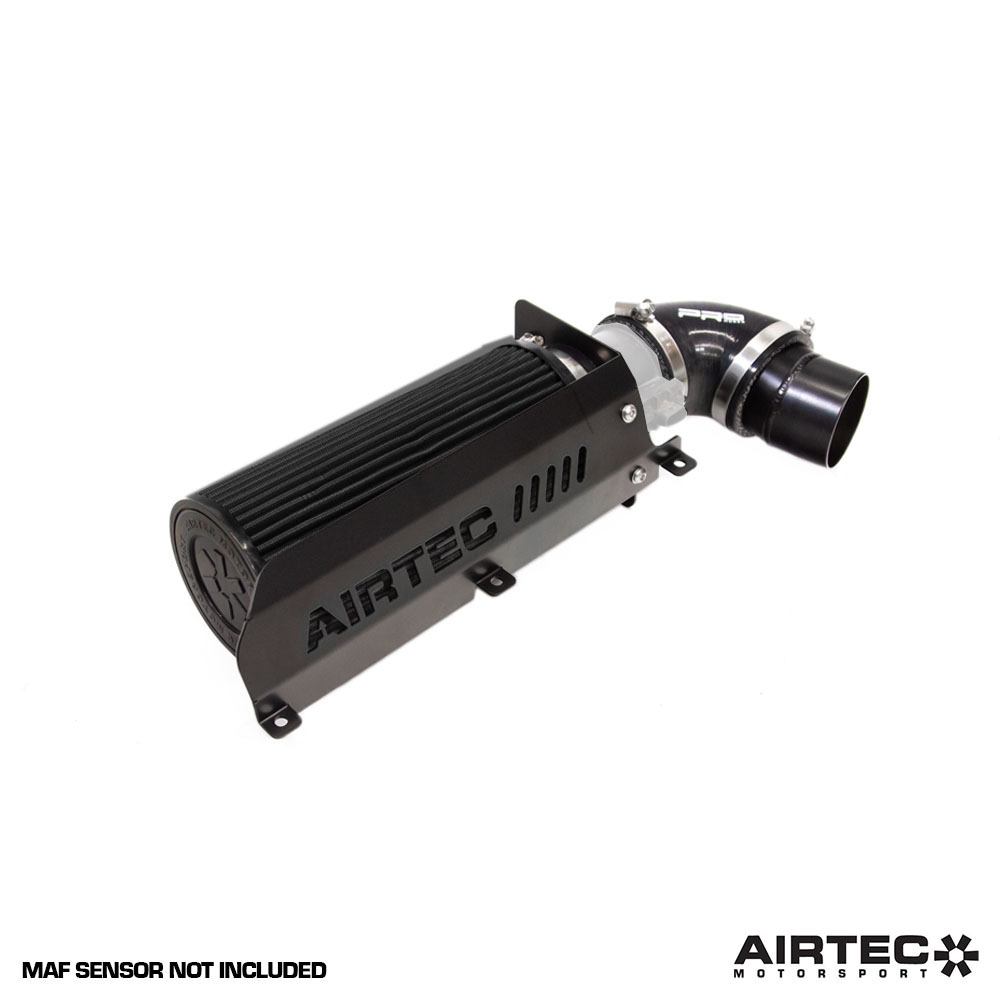 The kit features a huge, free-flowing cotton air filter, replacement intake pipe, Pro Hoses silicone connector and laser cut mounting bracket all finished in a high quality and long lasting powder coat black finish. To ensure the new air filter suffers less with heat soak issues from the confines of the engine bay, the laser cut shield complete with AIRTEC logo provides a barrier from the heat of the engine.